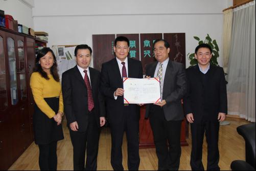 仲伟合(中)为陈峰(右二)颁发客座教授聘书