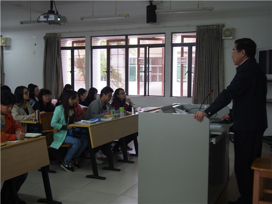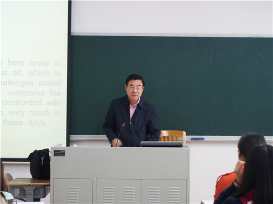 本网讯11月12日上午,我校云山讲座教授、国家外文出版事业发行局原副局长兼总编辑、中国翻译协会副会长、翻译专业教指委主任委员黄友义先生,在我院副院长赵军峰和翻译学研究中心主任莫爱屏的陪同下来到教学楼,再次为我院学生授课。授课对象是2014级MTI口译方向研究生。此次授课主题是关于中国文化对外交流的汉译英翻译。黄友义先生讲授了形式多样、内容丰富,引人入胜、发人深思的一课。