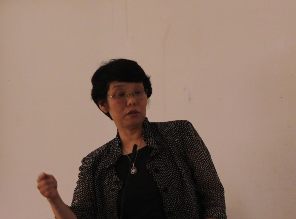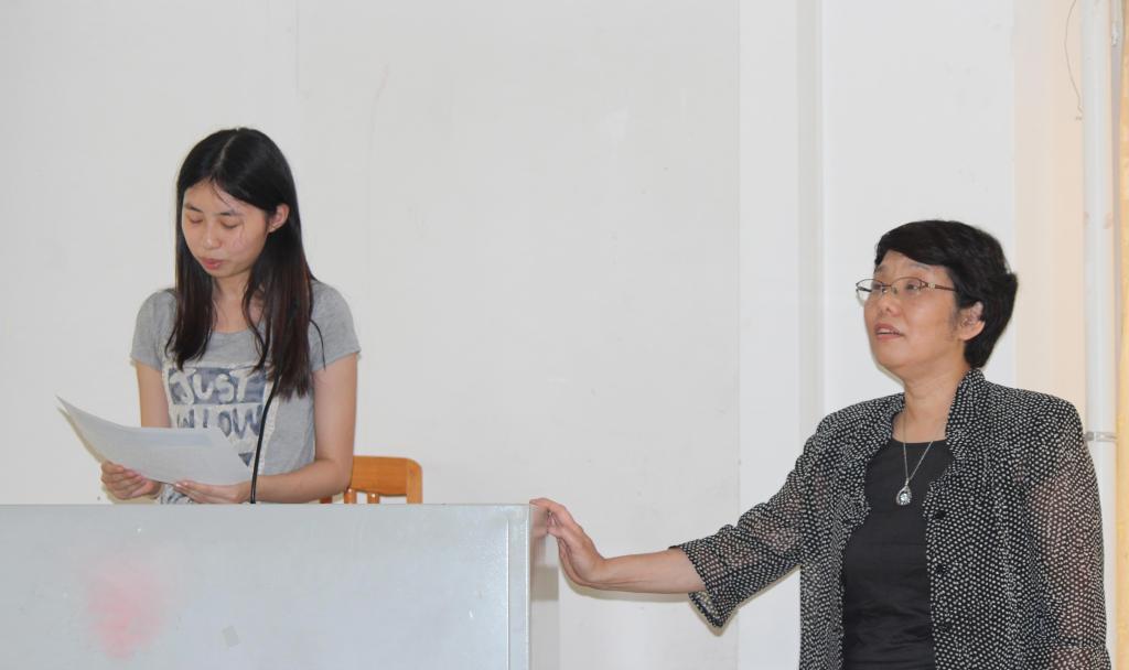顾名思义,本次讲座主要是介绍提高口译学习者的语音表现能力的教学方法。塚本教授围绕“培养自然流畅的日语语音表现能力”及“集中注意力,提高语音表现能力”两个方面进行了讲解。在介绍“获得自然的语音表现能力”的教学方法时,塚本教授先后让两名学生上台对一段日语新闻进行现场朗读并翻译成中文。起先两名同学由于对新闻内容不熟悉,朗读时受限于单个生词,加之断句错误,语调平板,让听众不知所言。但在塚本教授指导下,经过“用母语讲出文章意思——用母语重复文章——用母语概括,并重复练习以至流畅——用外语朗读——理解意思与声情并茂的表现相结合”这一个流程的练习后,两位同学再次朗读时声音抑扬顿挫,听众也更容易听懂了。