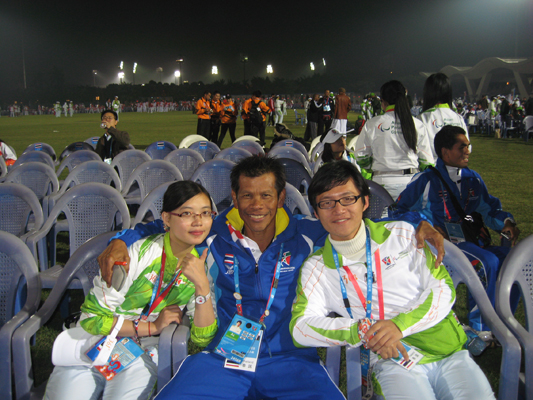 同样怀着渴望为运动会服务的心情,10级12班信管专业的杨晓彬以泰国MPC助理的身份参加了这次亚残志愿者工作。杨晓彬感慨地说,随团助理并不是一份轻松的工作,却更有意义。提起亚残会期间最让他印象深刻的事情时,杨晓彬微笑着说,“有一次跟随泰国医生到场馆,那里正在举行坐式篮球比赛,选手们的精神和拼劲令我感到非常震撼。在随团期间,我还收到了泰国代表团送的围巾和领带等小礼物,让人觉得很贴心。”
