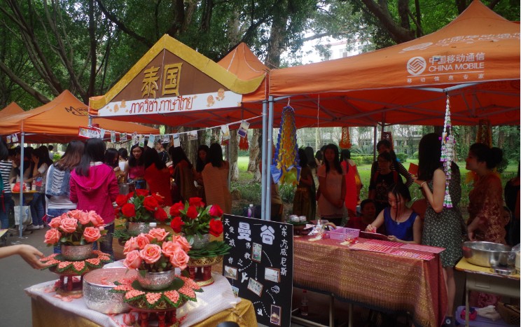 本网讯4月10日下午,广东外语外贸大学东方语言文化学院“第三届亚洲文化节之亚洲风情街”于北校区主校道正式开幕。