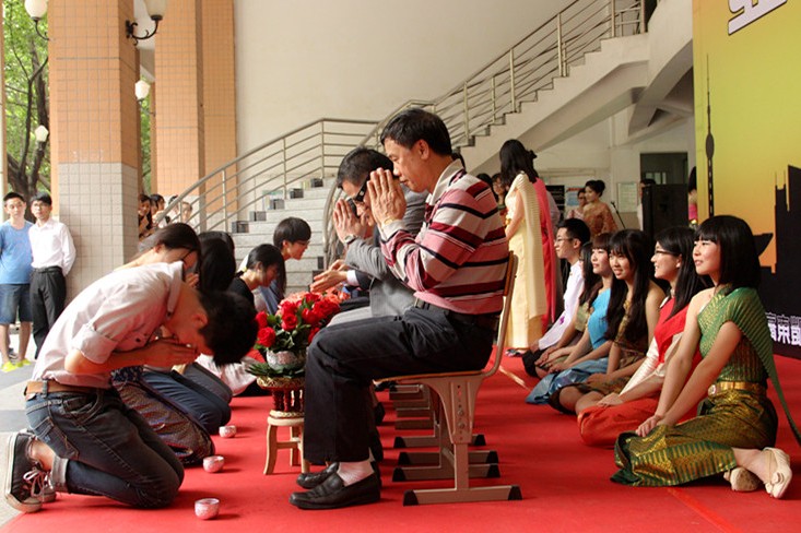 其后,泰语系师生通过表演向观众展示了泰国传统节日“宋干节”里的一些传统习俗。展示过程中,还邀请了相关领导和老师们一同感受“滴水礼”仪式。