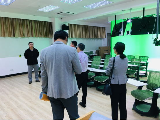 张老师首先向他们介绍了我校的虚拟仿真实验室,讲解虚拟技术对教学的辅助作用,并演示了虚拟技术系统的实际操作,还谈及该实验室可辅助微课、慕课的录制,还可模拟用于实践教学的各类场景。