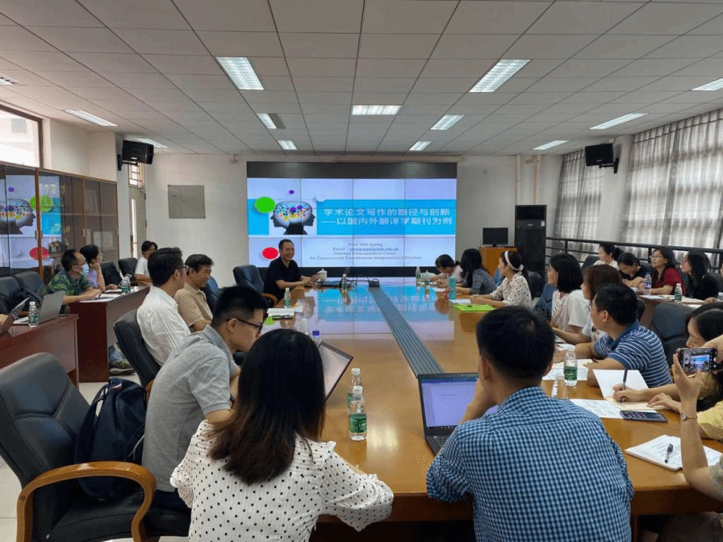 本网讯 2020年9月25日上午,广东外语外贸大学教师发展中心、广东外语外贸大学国家级同声传译实验教学中心承办的“云山口译大讲堂”(第6讲)在广外举办,广东外语外贸大学国家级同声传译实验教学中心主任莫爱屏教授围绕“学术论文写作的路径与创新——以国内外翻译学期刊为例”展开学术报告。本次活动得到了广大师生的大力支持,多名来自广外高翻学院、国际商务英语学院的专家学者听取讲座,并积极参与交流、发表了真知灼见,为学员们提供了一个学术交流的盛宴。来自新西兰奥克兰大学、澳门大学、广东外语外贸大学、广东金融学院等海内外多所高校的30名硕士和博士研究生、翻译中心研究员以及访问学者等参加了本次研修活动。